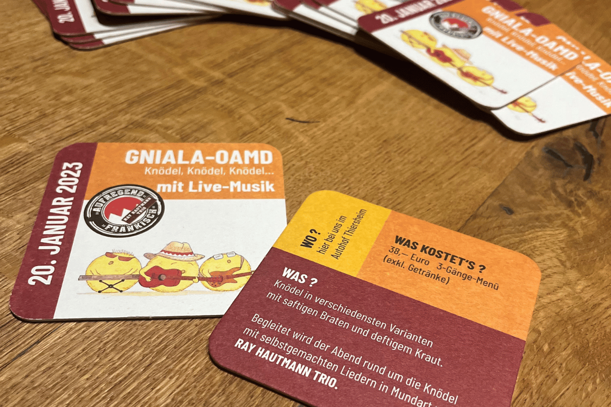 ...in allen Varianten gibt´s bei uns am 20. Januar im Autohof Thiersheim. Dazu spielt das Ray Hautmann Trio handgemachten Folk und Rythm & Blues. Mit ihren selbstgemachten Liedern in Mundart begleiten Sie unseren Gniala Oamd mit fränkischem Feinsinn und Humor. Servieren werden wir ein 3-Gänge Menü auf Platten, mit Knödel in allen Varianten und dazu die passenden Braten und Kraut. Die Eintrittskarten (38,- € exkl. Getränke) sind ab sofort bei uns im Tank-Shop erhältlich. Einlass ist ab 18.00 Uhr - aber auch die späteren Gäste kriegen noch was zum Essen.